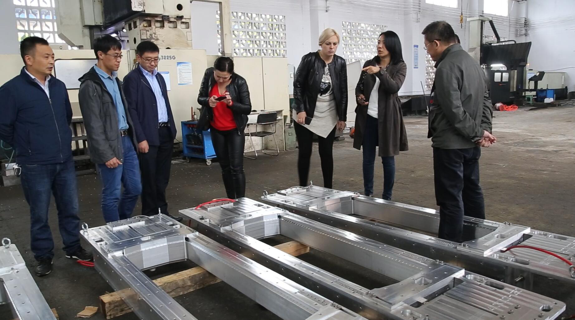 重庆庭澳公司总经理黄春、河南洛阳达奥公司总经理黄河陪同俄铝客人参观了公司生产车间,介绍了铝合金熔铸结晶器的制造工艺。